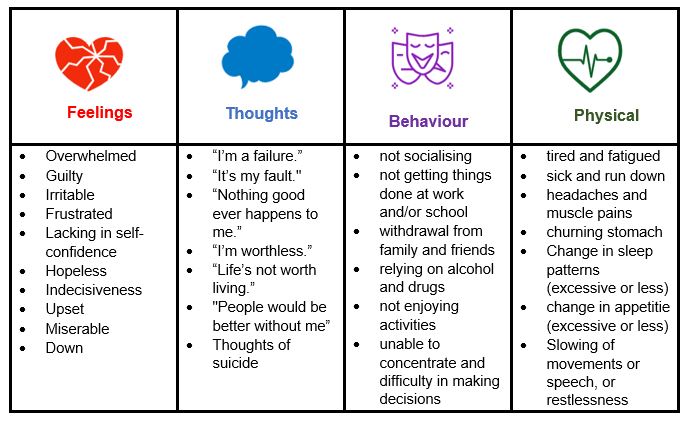 These are just some of a number of symptoms that may be experienced. It’s important to remember that we are all different and may experience some of these symptoms listed below from time to time, and it may not necessarily mean we’re depressed. Likewise, not everyone who is experiencing depression will have all of these symptoms listed below.